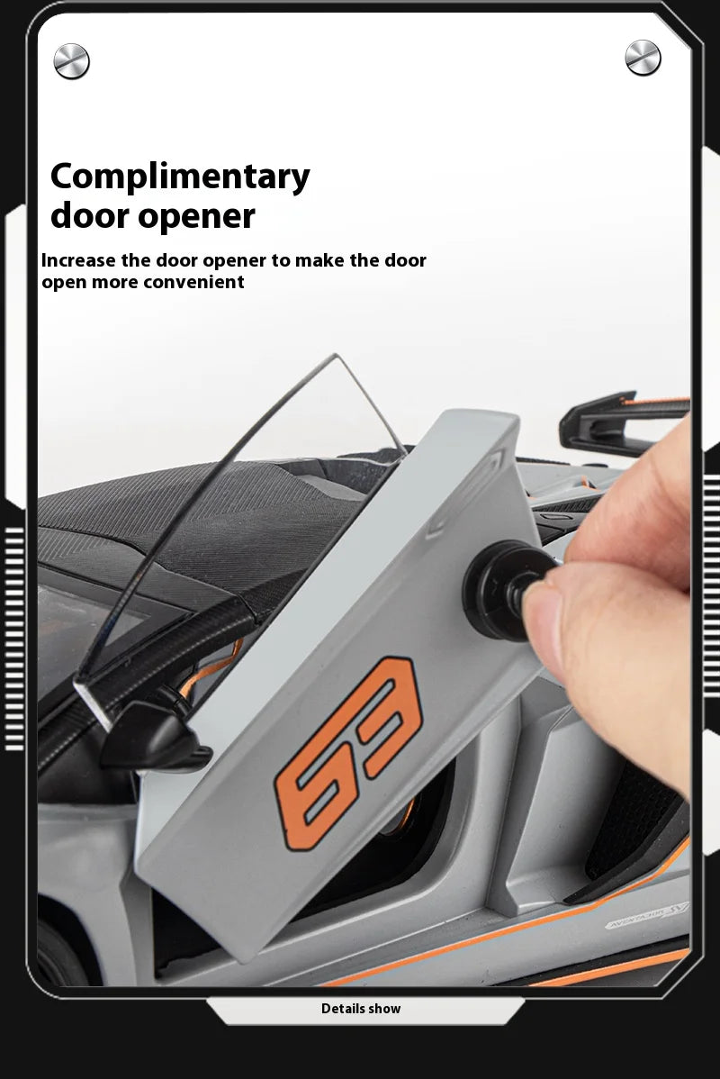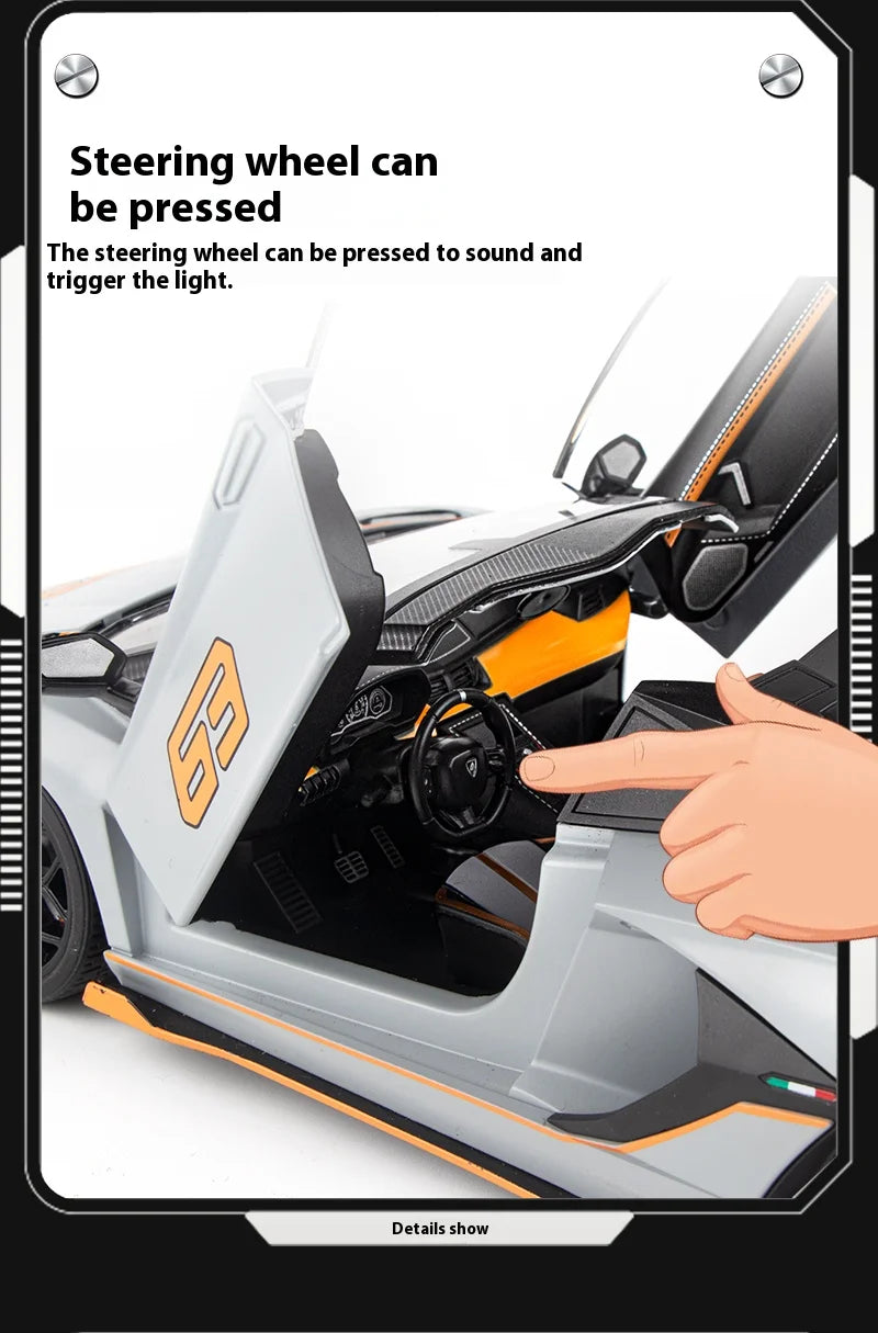 Experience the 1:18 Scale SVJ63 Alloy Car Toy Model with realistic details, authentic sound, and light effects. Durable and immersive, it is ideal for collectors and enthusiasts, capturing the essence of the iconic SVJ63 for display or play.