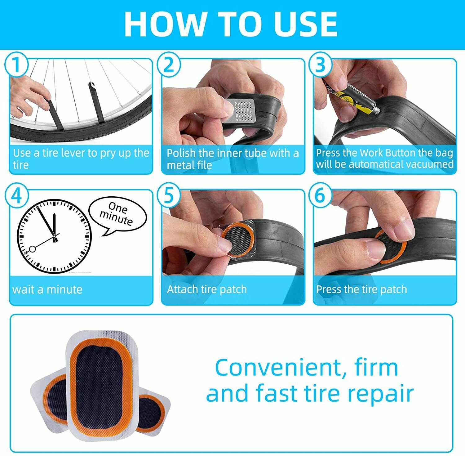 KT Deals Bike Tire Repair Patches with Glue and Lever Tool Quick Fix Puncture DIY Patch Set Bicycle Repair Kit for MTB Cycling Road Bikes Flat Inner Tube, Also for Motorcycle, BMX and Inflatable Rubber. How to Use? - Scuff the punctured area with the metal-scuffer (provided). Squeeze the glue and spread around the punctured area