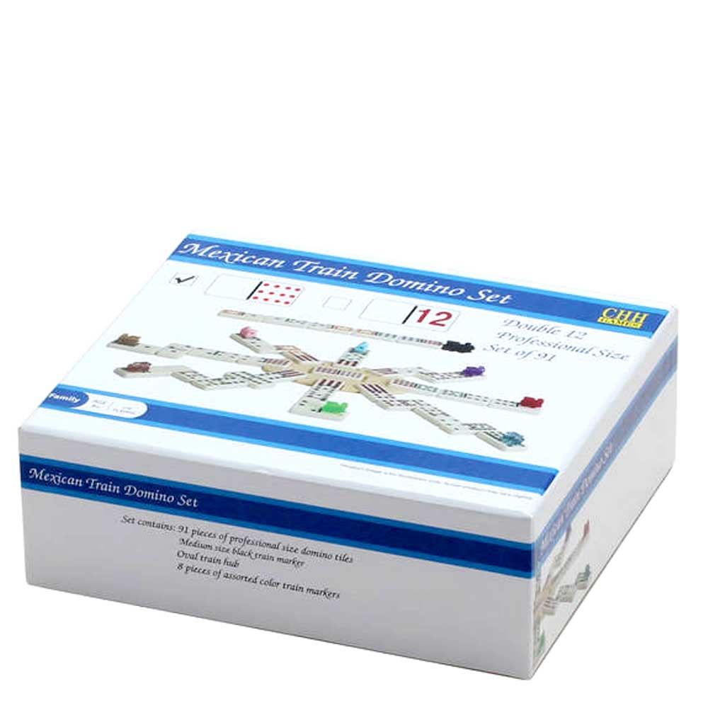 Double 12 professional size color dot white tile dominoes. Comes with a hub, 8 small train markers, and a large train marker.