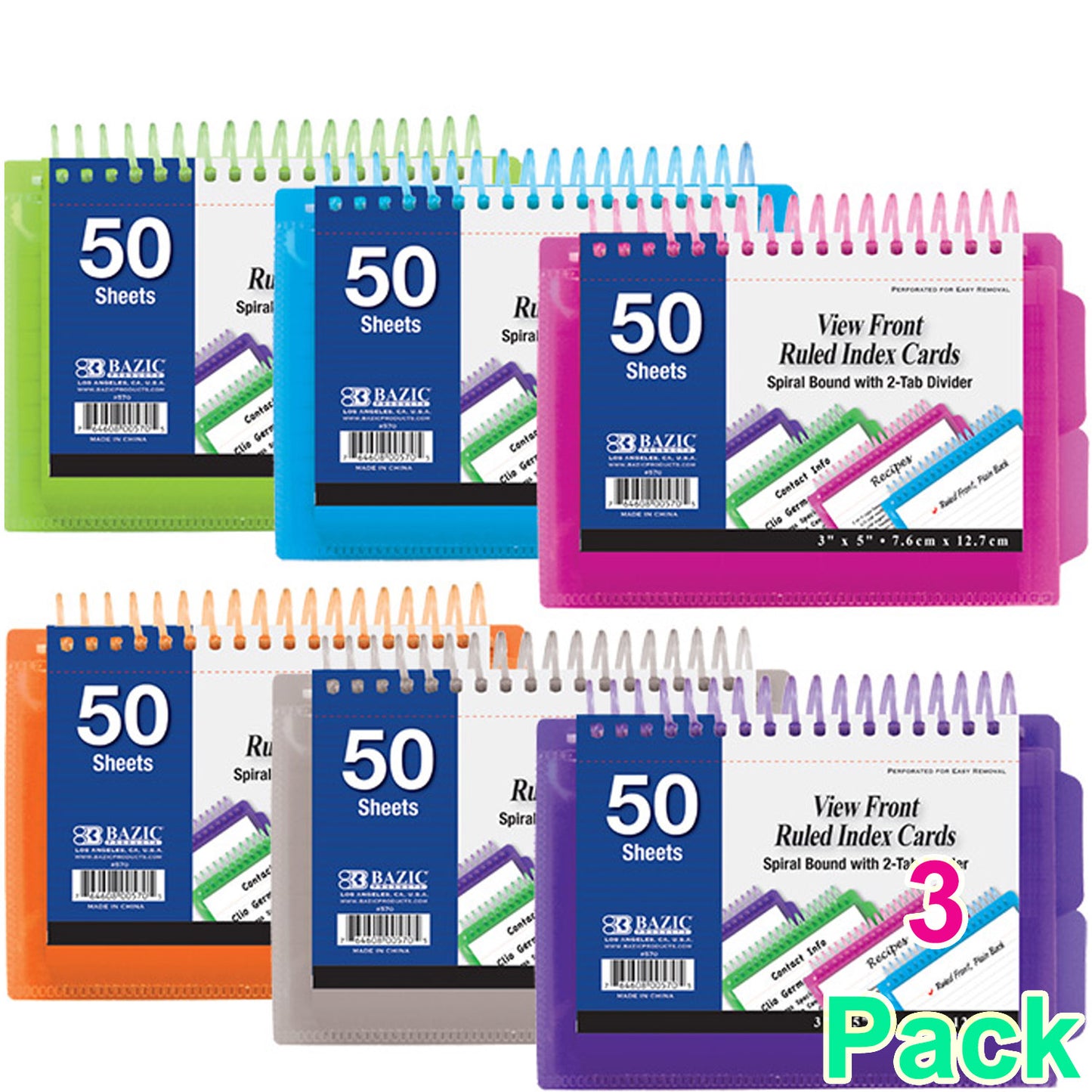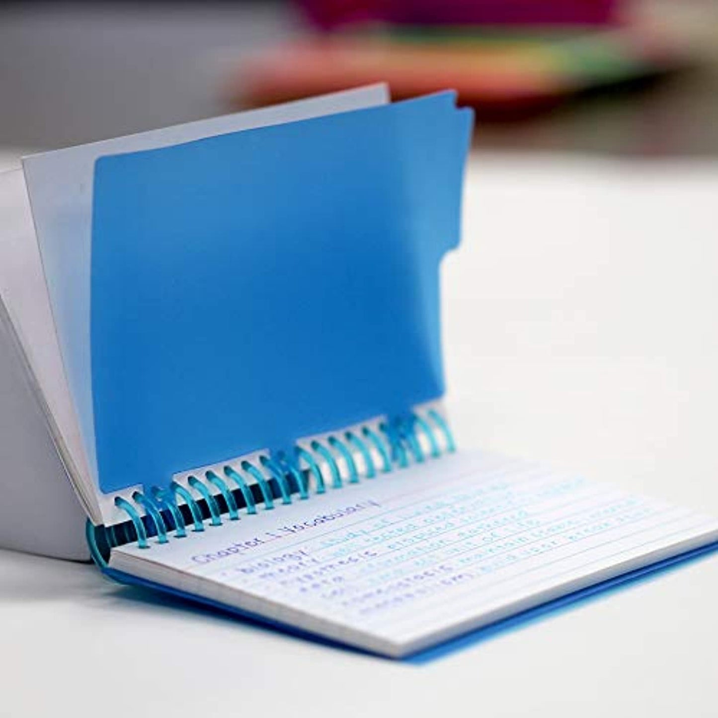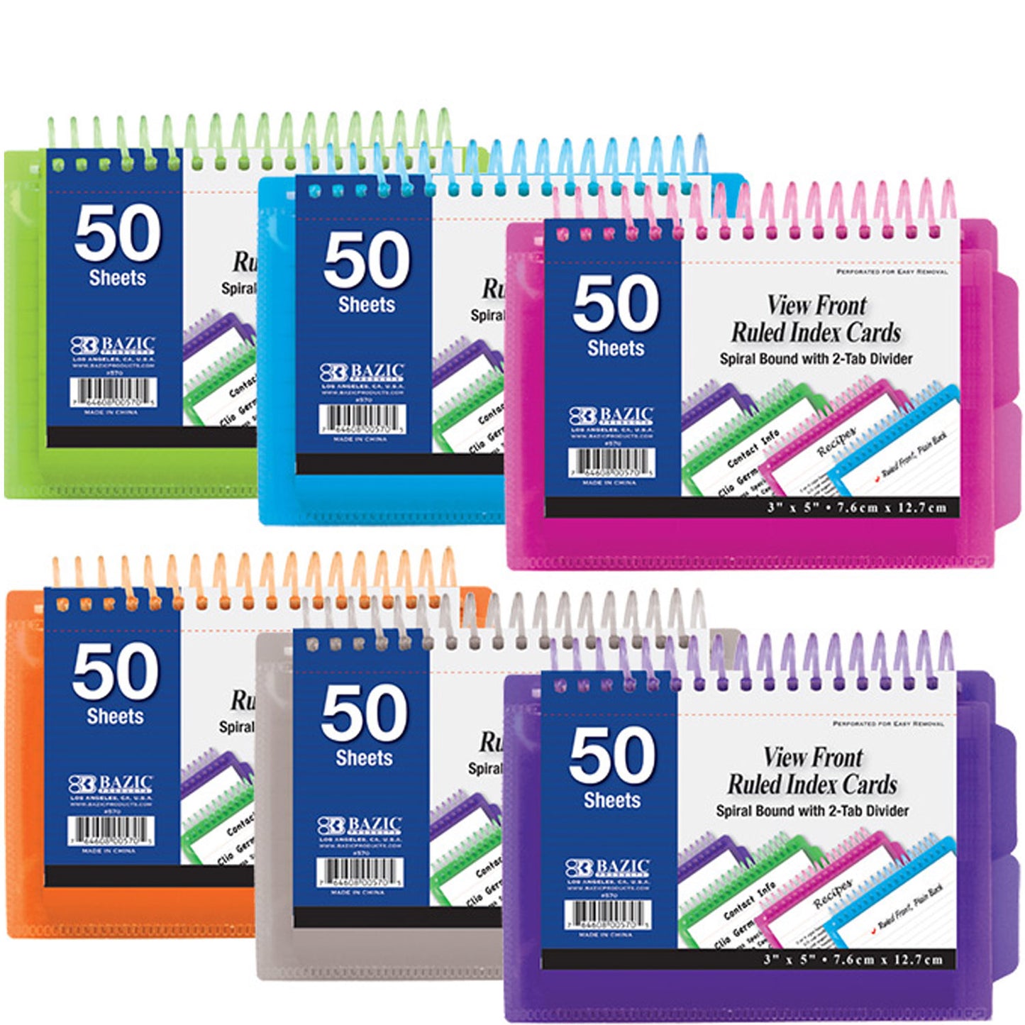 - 50 Count View Poly Spiral Bound 3" x 5" Ruled White Index Card w/ 2-Tab Divider, Lined Study Note Cards Flash Cards Assorted Colors