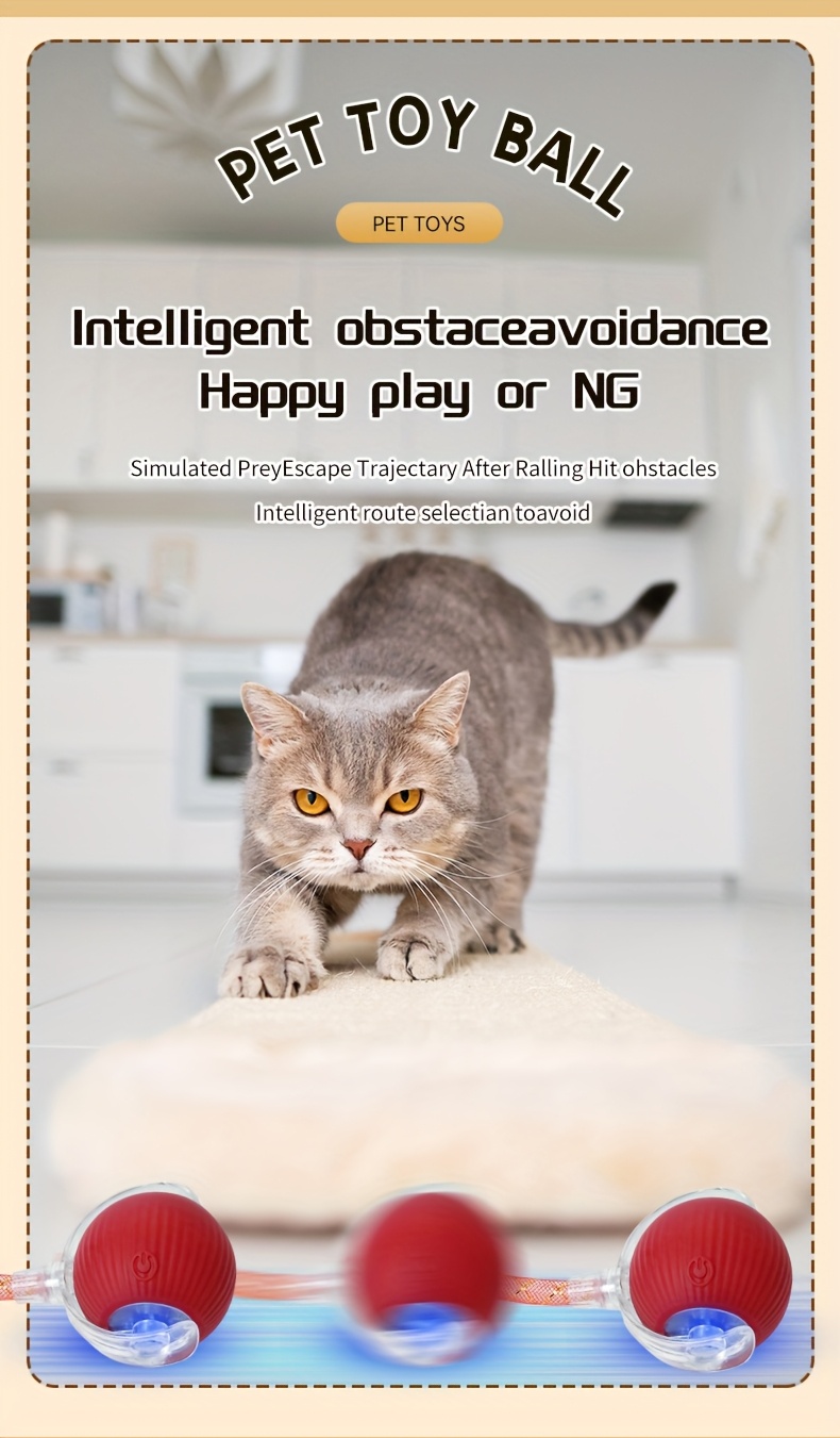 Interactive Cat Toy Ball with Automatic Movement & Obstacle Avoidance - USB Self-Propelled Rolling Ball with Elastic Tail, Smart Motion Sensor, and Durable Surface for Floor, Carpet, and Tile. Safe for Indoor Cats of All Breeds & Sizes