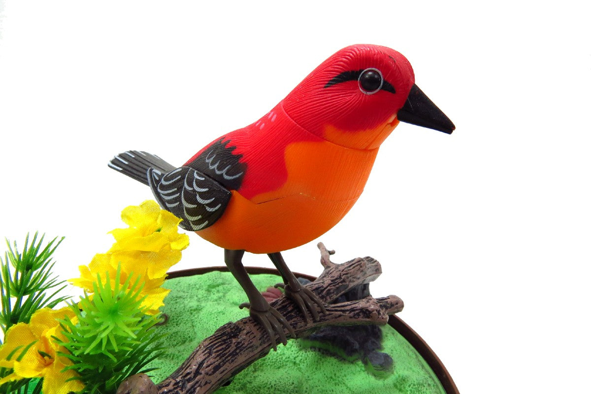 All you have to do is create a sound near the bird on the branch, and it will start to shake its head, open its mouth, shake its wing and tail, and sing a bird song.