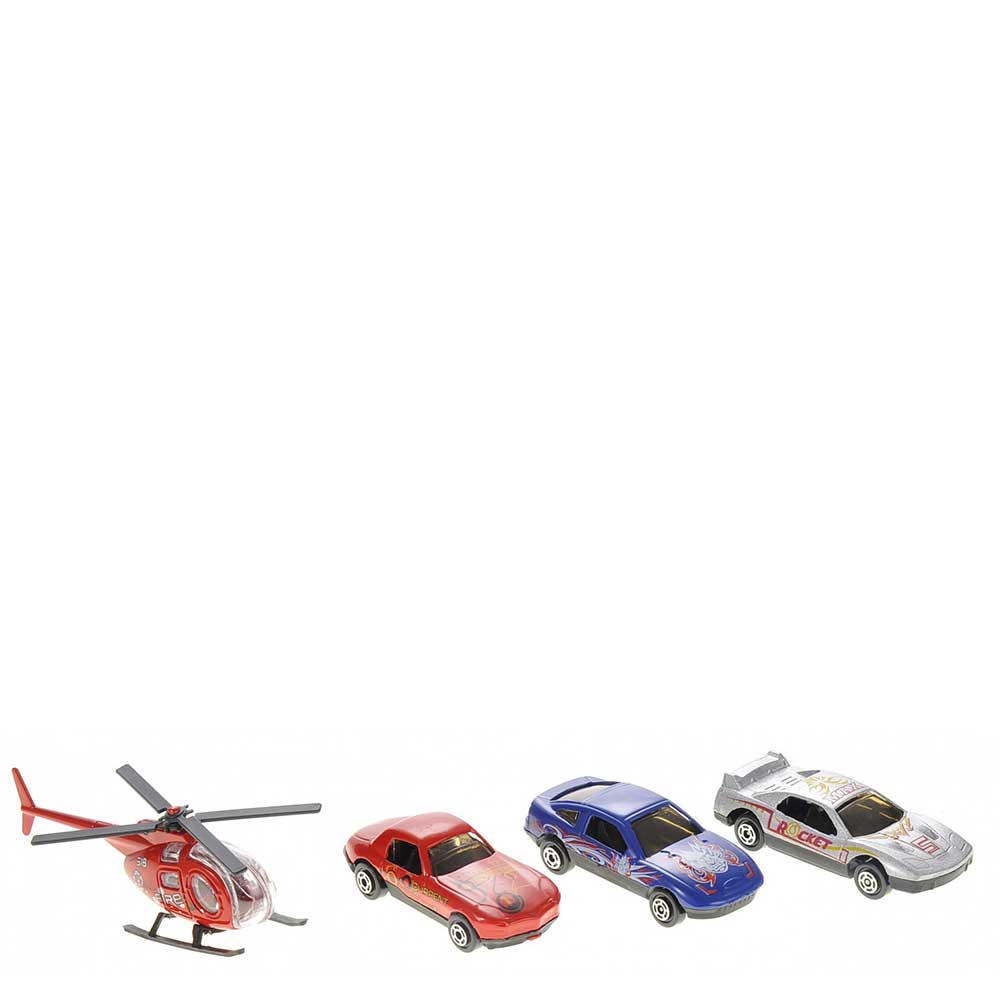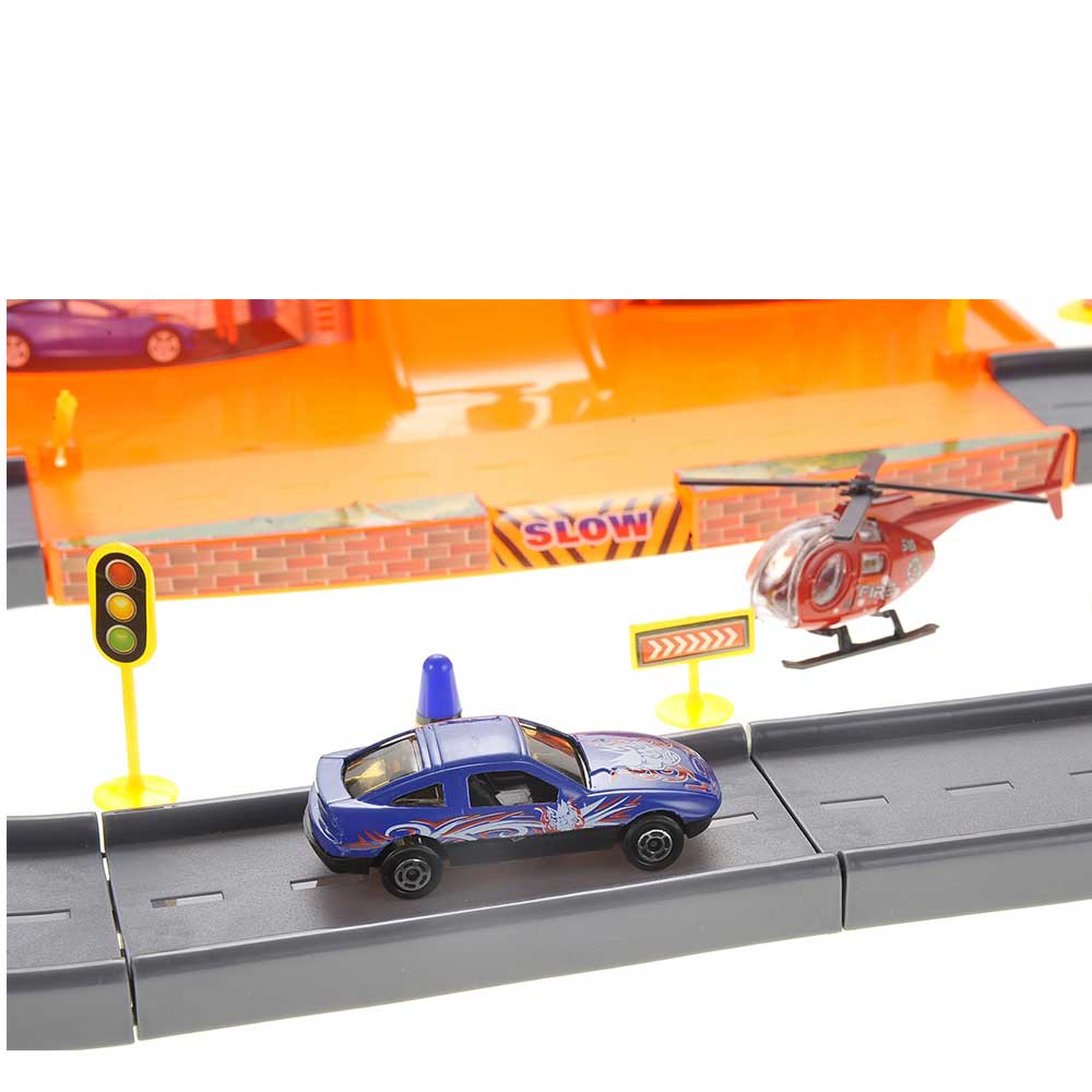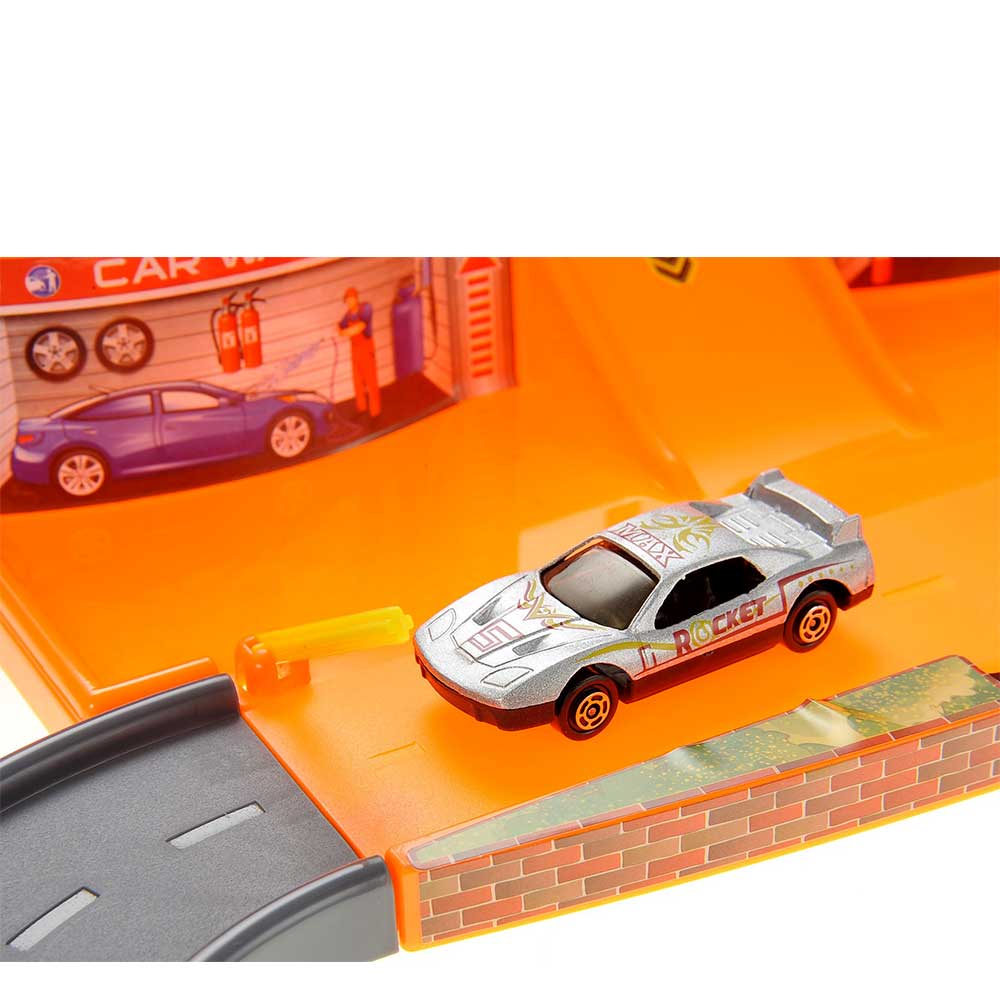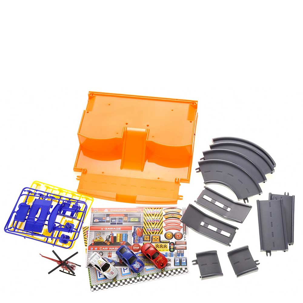 The track set parking garage brings hours of fun with the different included settings. For example, the parking garage can be a raceway for speedy drivers, and do not forget to fill up the gas at the gas station. After the gas station, kids can get their car washed, so it'll look shiny to show off to others. This set also comes with a helicopter and a landing zone. Contains 3 Sportscar and helicopters.